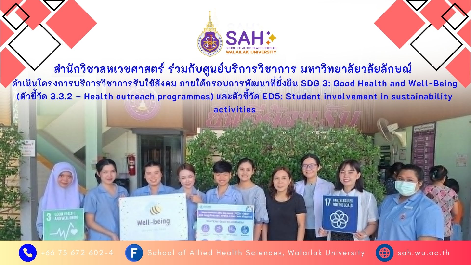 ข่าวประชาสัมพันธ์ อ่านข่าวทั้งหมด สำนักวิชาสหเวชศาสตร์ ร่วมกับศูนย์บริการวิชาการ มหาวิทยาลัยวลัยลักษณ์ นำโดย ผู้ช่วยศาสตราจารย์ ดร. วันทนีย์ โยชน์ชัยสาร และ รองศาสตราจารย์ ดร. นิธิตา ปิยอมรพันธุ์ เดินหน้าจัดทำ “โครงการบริการวิชาการรับใช้สังคม” โดยมุ่งเน้นการบูรณาการความรู้สู่ชุมชน Read More » 23/03/2026 13:44 วลัยลักษณ์ น้อมกตัญญู บูชาอาจารย์ใหญ่ Read More » 02/03/2026 10:00 สหเวชศาสตร์เปิดบ้านต้อนรับศึกษาศาสตร์ แลกเปลี่ยนเรียนรู้ระบบบริหารและประกันคุณภาพ สู่ความเป็นเลิศอย่างยั่งยืน Read More » 26/02/2026 15:47 « Page1 Page2 Page3 … Page5 » ข่าวเด่น อ่านข่าวทั้งหมด วลัยลักษณ์ น้อมกตัญญู บูชาอาจารย์ใหญ่ Read More » 02/03/2026 10:00 สาขาวิชากายภาพบำบัด สำนักวิชาสหเวชศาสตร์ มหาวิทยาลัยวลัยลักษณ์ ขอร่วมส่งกำลังใจให้แก่นักกีฬาและบุคลากรทางวิชาชีพ ในการแข่งขัน Dubai 2025 Asian Youth Para Games Read More » 22/12/2025 14:56 ตัวแทนนักศึกษาหลักสูตรเทคนิคการแพทย์ สำนักวิชาสหเวชศาสตร์ ม.วลัยลักษณ์ คว้ารางวัลที่ 1 เวที R2M รอบภูมิภาค ตัวแทนภาคใต้ สู่เวทีระดับประเทศ Read More » 18/12/2024 14:15 « Page1 Page2 Page3 … Page5 » ข่าวนักศึกษา อ่านข่าวทั้งหมด สหเวชศาสตร์สุดปัง! ปี 1 เทคนิคการแพทย์ ผงาดเหรียญทองแดง อินทนิลเกมส์ Read More » 03/02/2026 16:07 หลักสูตรกายภาพบำบัด สำนักวิชาสหเวชศาสตร์ จัดกิจกรรมปฐมนิเทศนักศึกษากายภาพบำบัด ประจำภาคการศึกษา 2/2568 Read More » 14/11/2025 10:11 นักศึกษากายภาพบำบัด สำนักวิชาสหเวชศาสตร์ มหาวิทยาลัยวลัยลักษณ์ เข้าร่วมกิจกรรมพัฒนาทักษะกายภาพบำบัดทางการกีฬาในการแข่งขันกีฬามหาวิทยาลัยแห่งประเทศไทย ครั้งที่ 51 รอบคัดเลือกเขตภาคใต้ ระหว่างวันที่ 8–13 พฤศจิกายน 2568 ณ มหาวิทยาลัยวลัยลักษณ์ Read More » 13/11/2025 15:00 « Page1 Page2 Page3 … Page5 » ข่าวรับสมัครงาน อ่านข่าวทั้งหมด ประกาศ รับสมัครพนักงานวิสาหกิจ ตำแหน่งนักวิชาการ สังกัดโครงการพิเศษหลักสูตรเทคนิคการแพทย์ นานาชาติ สำนักวิชาสหเวชศาสตร์ จำนวน 1 อัตรา Read More » 06/03/2025 14:44 สำนักวิชาสหเวชศาสตร์ มหาวิทยาลัยวลัยลักษณ์ รับสมัครอาจารย์ สาขาวิชากายภาพบำบัด จำนวน 3 อัตรา Read More » 27/06/2024 14:05 ประกาศรับสมัครอาจารย์ หลักสูตรเทคนิคการแพทย์ จำนวน 5 อัตรา Read More » 27/06/2024 12:21 ยอดผู้เข้าชม : 41,858