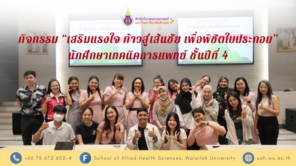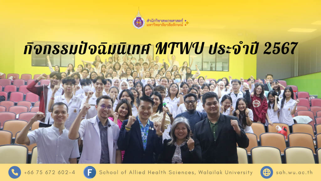 เมื่อวันที่ 2 เมษายน 2568 สาขาวิชาเทคนิคการแพทย์ สำนักวิชาสหเวชศาสตร์ มหาวิทยาลัยวลัยลักษณ์ ได้จัดกิจกรรมปัจฉิมนิเทศ MTWU ประจำปี 2567 ภายใต้แนวคิด “พร้อมก้าวสู่อนาคต ด้วยความรู้ หัวใจ และจรรยาบรรณ” โดยกิจกรรมนี้จัดขึ้นเพื่อเตรียมความพร้อมให้นักศึกษาหลักสูตรเทคนิคการแพทย์และหลักสูตรเทคนิคการแพทย์นานาชาติที่กำลังจะสำเร็จการศึกษา ให้พร้อมก้าวสู่การทำงานอย่างมีคุณภาพและมีจิตสำนึกรับใช้สังคม