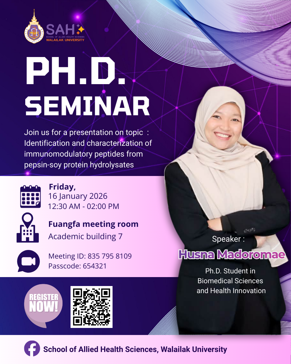 News International MESMAP-12 and THAIMAP Conference Held at Bangsan Beach, Chonburi, Thailand Read More » 26/01/2026 11:13 School of Allied Health Sciences, Walailak University Hosts Visiting Professor 2026 to Strengthen International Academic and Research Collaboration Read More » 21/01/2026 12:10 PhD Student Presents Breakthrough Research on Soy Peptides at Biomedical Sciences Seminar Read More » 19/01/2026 14:35 Visiting Professors from International Institutions Join SAH for Academic and Research Exchange Read More » 08/01/2026 13:53 School of Allied Health Sciences, Walailak University Welcomes Visiting Asst. Prof. Yukawa Masashi from Ehime University, Japan Read More » 08/01/2026 13:25 The Physical Therapy Program, School of Allied Health Sciences, Walailak University, Warmly Welcomes Students for TCAS69 Interview Examinations Read More » 01/01/2026 10:39 « Page1 Page2 Page3 … Page5 » School of Allied Health Sciences, Walailak University ยอดผู้เข้าชม : 5,340