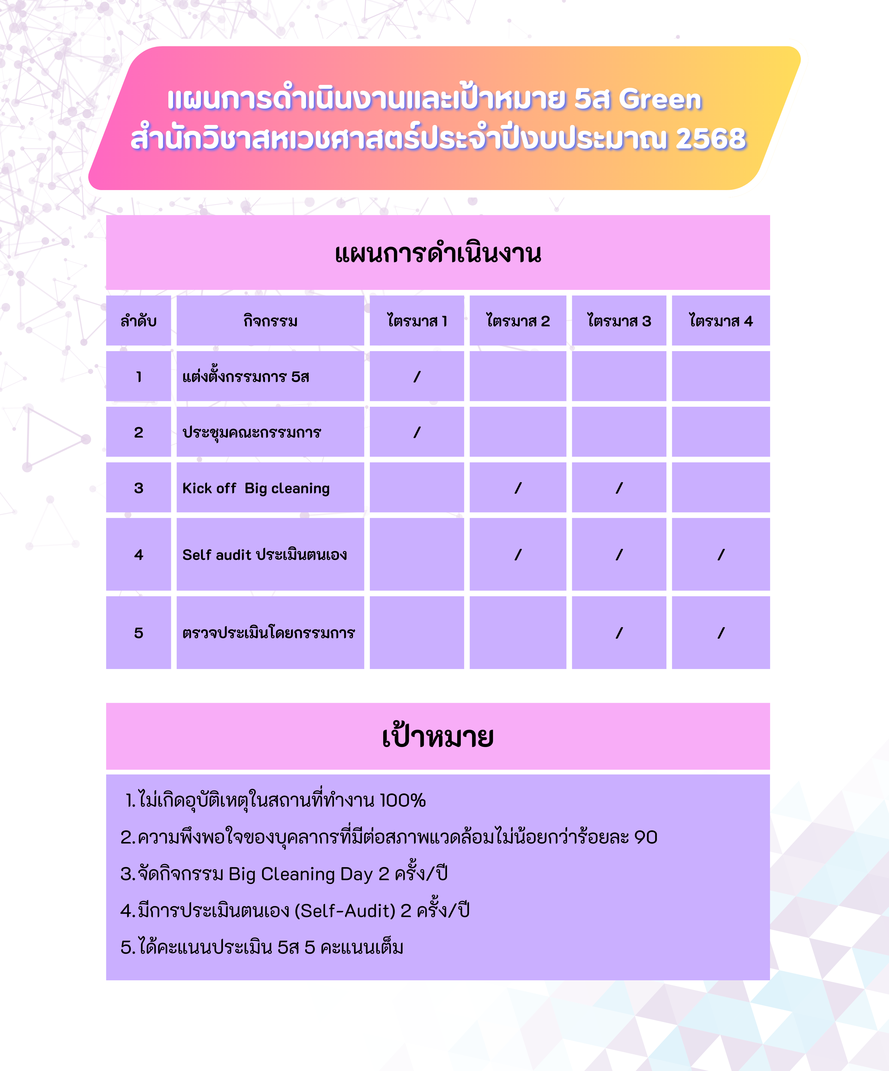 แผนการดำเนินงานและเป้าหมาย 5ส Green สำนักวิชาสหเวชศาสตร์