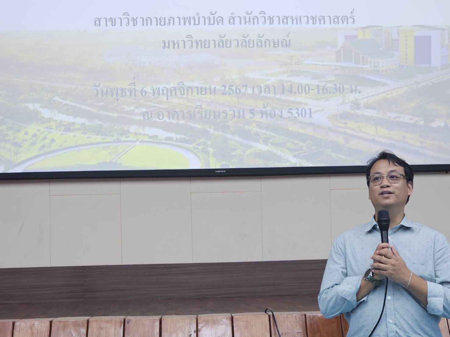 เมื่อวันที่ 6 พฤศจิกายน 2567 หลักสูตรกายภาพบำบัด สำนักวิชาสหเวชศาสตร์ ได้จัดกิจกรรมปฐมนิเทศและพบอาจารย์ที่ปรึกษาประจำปีการศึกษาที่ 2/2567 ให้แก่นักศึกษากายภาพบำบัด ชั้นปีที่ 2 และ 3 โดย อาจารย์ ดร.ปริญญา ว่องไววณิชกุล หัวหน้าสาขาวิชากายภาพบำบัด อาจารย์ ดร.จารุภา เลขทิพย์ ประธานอหลักสูตรกายภาพบำบัด อาจารย์ ดร.วันทนีย์ โยชน์ชัยสาร หัวหน้าโครงการฯ และคณาจารย์ในหลักสูตรกายภาพบำบัดเข้าร่วมกิจกรรม ณ ห้อง 5301 อาคารเรียนรวม 5 มหาวิทยาลัยวลัยลักษณ์