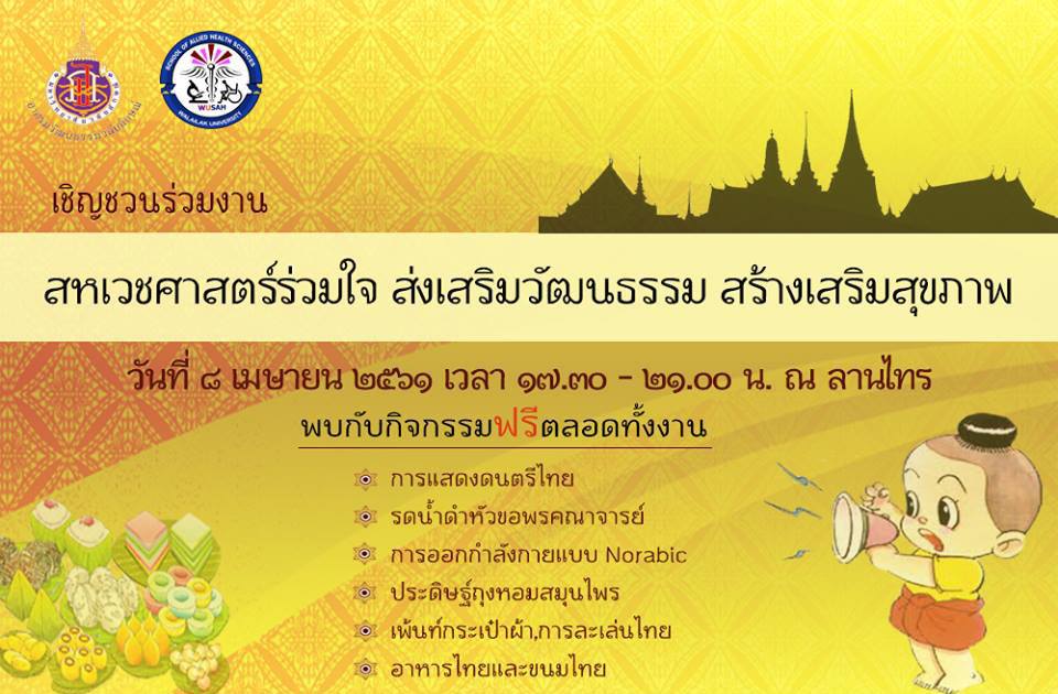 สำนักวิชาสหเวชศาสตร์ ร่วมกับ อาศรมวัฒนธรรม มหาวิทยาลัยวลัยลักษณ์ ขอเชิญเข้าร่วมงาน สหเวชศาสตร์ร่วมใจ ส่งเสริมวัฒนธรรม สร้างเสริมสุขภาพ ในวันอาทิตย์ ที่ 8 เมษายน 2561 เวลา 17.30-21.00 น. ณ บริเวณลานไทร (ข้างอาคารกิจกรรม ) พบกับกิจกรรมสืบสานประเพณีไทยเเละสาระความรู้ต่าง ๆ ร่วมรับประทานอาหารไทยและแต่งกายชุดเเบบไทย