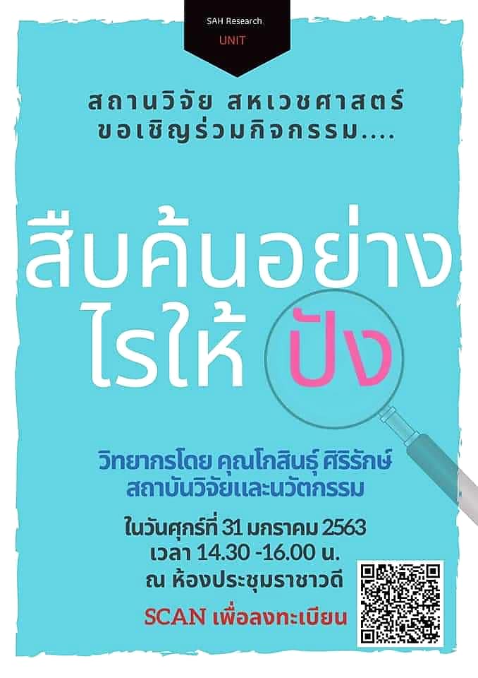31 มกราคม 2563 สถานวิจัย สำนักวิชาสหเวชศาสตร์ โดย รองศาสตราจารย์ ดร. มนัส โคตรพุ้ย หัวหน้าสถานวิจัย สำนักวิชาสหเวชศาสตร์ กล่าวรายงานที่มาของกิจกรรม “สืบค้นอย่างไรให้ ปัง” และได้รับเกียรติจากรองศาสตราจารย์ ดร.จิตรบรรจง ตั้งปอง คณบดีสำนักวิชาสหเวชศาสตร์ กล่าวต้อนรับคุณโกสินธุ์ ศิริรักษ์ จากสถาบันวิจัยและนวัตกรรม ที่มาเป็นวิทยากรในกิจกรรม “สืบค้นอย่างไรให้ ปัง” โดยวิทยาการได้ให้ความรู้ในการเลือกวารสารในการตีพิมพ์ในฐานข้อมูลนานาชาติพร้อมแนะนำเทคนิคการเลือกวารสารให้เหมาะสมกับงานวิจัย ซึ่งมีคณาจารย์เข้าร่วมกิจกรรมกว่า 21 คนด้วยกัน