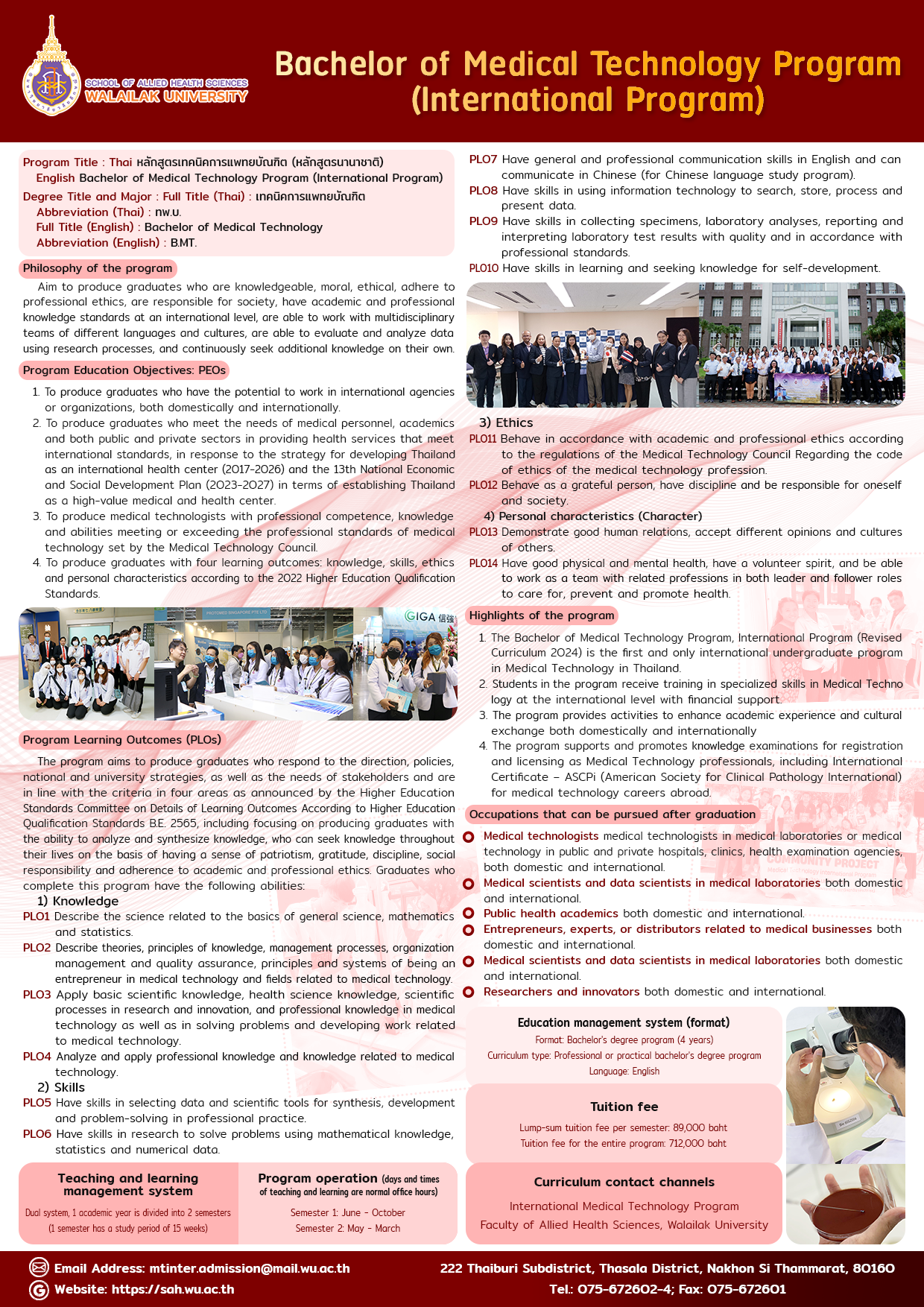 - The Bachelor of Medical Technology Program, International Program (Revised Curriculum 2024) is the first and only international undergraduate program in Medical Technology in Thailand.