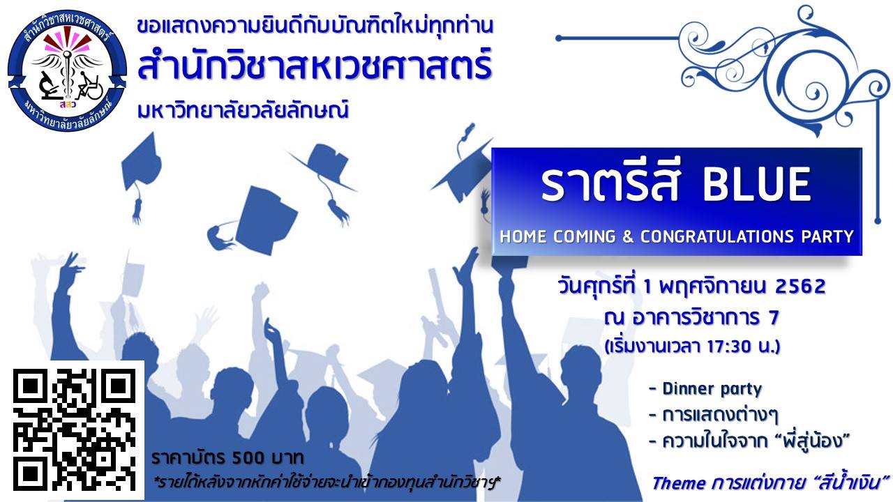 ขอเรียนเชิญบัณฑิตใหม่ทุกท่านเข้าร่วมงาน “ราตรีสีบลู” HOME COMING & CONGRATULATIONS PARTY Read More » 18/10/2019 16:26