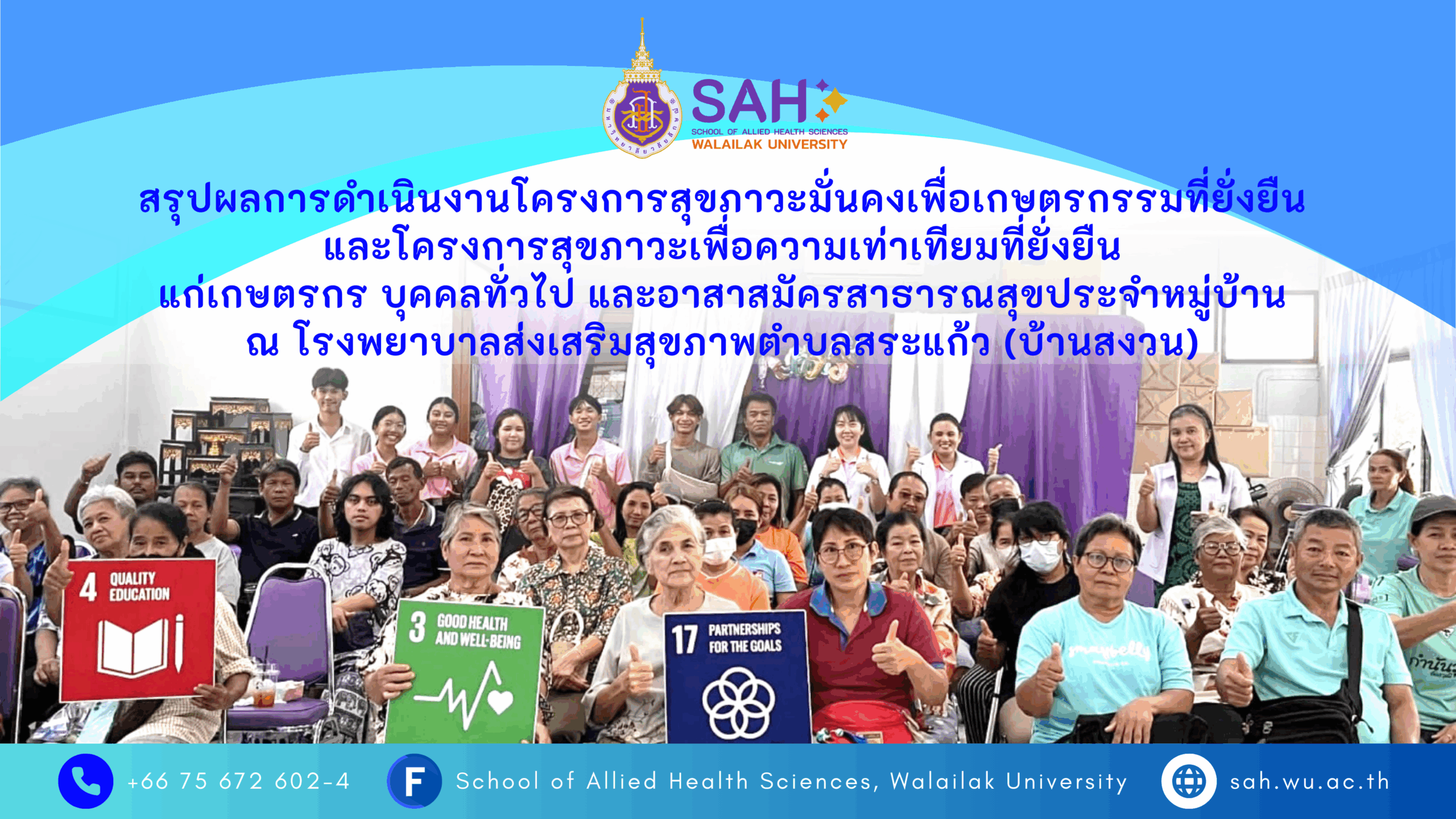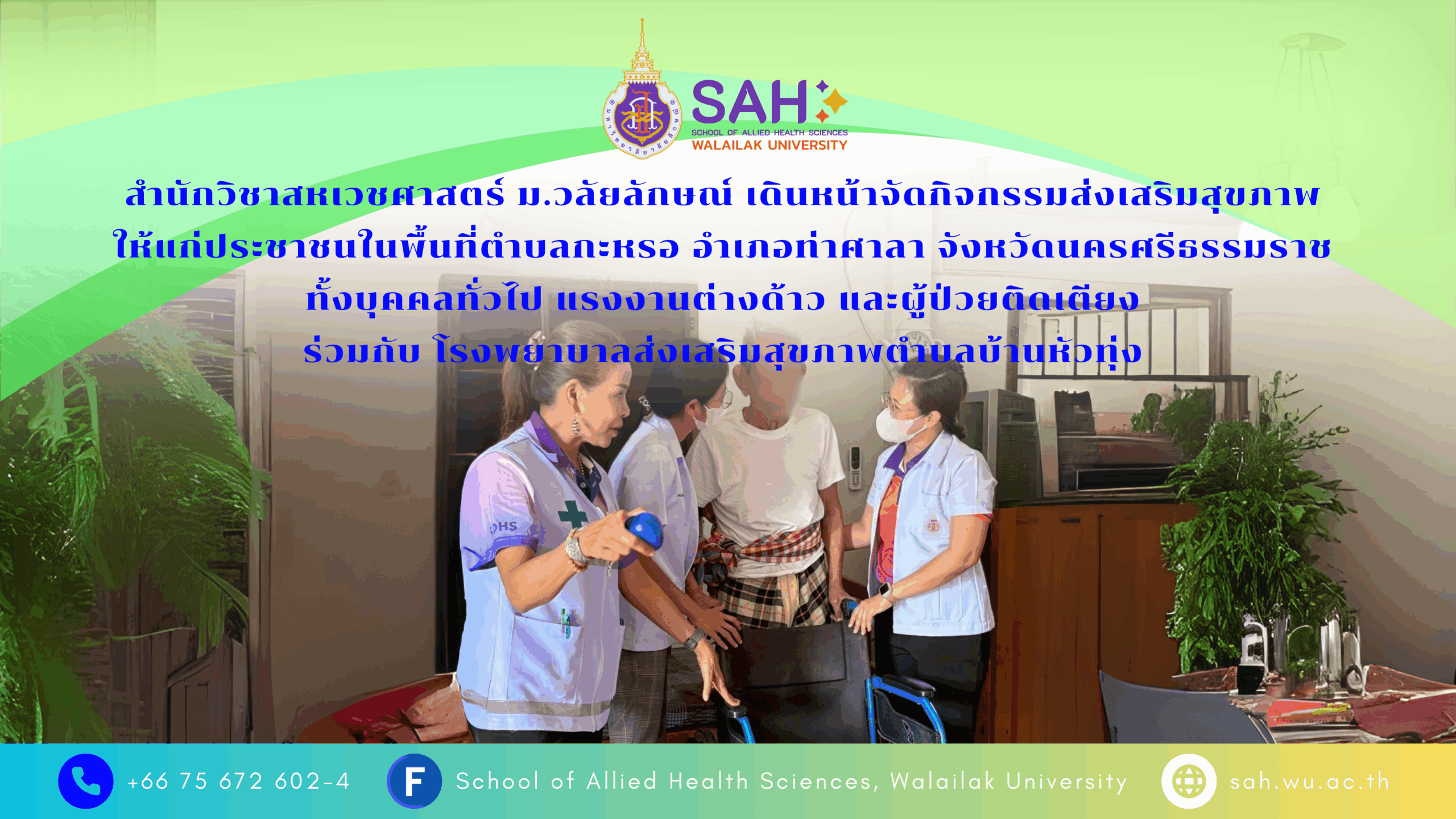 ข่าวประชาสัมพันธ์ อ่านข่าวทั้งหมด สรุปผลการดำเนินงานโครงการสุขภาวะมั่นคงเพื่อเกษตรกรรมที่ยั่งยืน และโครงการสุขภาวะเพื่อความเท่าเทียมที่ยั่ง แก่เกษตรกร บุคคลทั่วไป และอาสาสมัครสาธารณสุขประจำหมู่บ้าน ณ โรงพยาบาลส่งเสริมสุขภาพตำบลสระแก้ว (บ้านสงวน)ยืน Read More » 12/09/2025 22:13 รศ.ดร.นิธิตา ปิยอมรพันธุ์ นำนักศึกษากายภาพบำบัด ชั้นปีที่ 4 ให้บริการวิชาการโครงการกระตุ้นการตระหนักรู้และการปรับเปลี่ยนพฤติกรรมสุขภาพ แก่ผู้ป่วยโรคไม่ติดต่อเรื้อรัง ณ รพ.สต. ชุมชนสาธิตวลัยลักษณ์พัฒนา Read More » 12/09/2025 18:17 สำนักวิชาสหเวชศาสตร์ ม.วลัยลักษณ์ เดินหน้าจัดกิจกรรมส่งเสริมสุขภาพ ให้แก่ประชาชนในพื้นที่ตำบลกะหรอ อำเภอท่าศาลา จังหวัดนครศรีธรรมราช ทั้งบุคคลทั่วไป แรงงานต่างด้าว และผู้ป่วยติดเตียง ร่วมกับ โรงพยาบาลส่งเสริมสุขภาพตำบลบ้านหัวทุ่ง Read More » 11/09/2025 17:23 « Page1 Page2 Page3 Page4 Page5 » ข่าวเด่น อ่านข่าวทั้งหมด หลักสูตรเทคนิคการแพทยบัณฑิต และหลักสูตรเทคนิคการแพทยบัณฑิต (หลักสูตรนานาชาติ) รับการตรวจประเมินรับรองหลักสูตรและรับรองสถาบันผู้ผลิตบัณฑิตเทคนิคการแพทย์ จากสภาเทคนิคการแพทย์ Read More » 15/02/2024 15:21 สโมสรนักศึกษาสำนักวิชาสหเวชศาสตร์ มหาวิทยาลัยวลัยลักษณ์ เข้าร่วมกิจกรรมกีฬาเทคนิคการแพทย์-สหเวชศาสตร์สัมพันธ์ ครั้งที่ 23 “ราชาวดีรังสิตเกมส์” ณ มหาวิทยาลัยรังสิต จังหวัดปทุมธานี Read More » 09/01/2024 09:56 โครงการ Global Multiprofessional and Cultural Camp 2023 SHOWA University, Japan and Walailak University, Thailand (7-12 Aug 2023) Read More » 12/08/2023 16:03 « Page1 Page2 Page3 Page4 Page5 » ข่าวนักศึกษา อ่านข่าวทั้งหมด สาขาวิชาเทคนิคการแพทย์ สำนักวิชาสหเวชศาสตร์ มหาวิทยาลัยวลัยลักษณ์ จัดกิจกรรมปัจฉิมนิเทศ MTWU ประจำปี 2567 Read More » 06/04/2025 12:25 อาจารย์ใหญ่…. ผู้ให้แห่งการเรียนรู้ รำลึกในพระคุณด้วยหัวใจ Read More » 06/04/2025 09:29 SAH Helper Team และพันธกิจสื่อสารองค์กร จัดกิจกรรม “เปิดบ้าน SAH Smile Club” เพื่อเสริมสร้างบรรยากาศผ่อนคลายในที่ทำงาน Read More » 15/03/2025 09:40 « Page1 Page2 Page3 Page4 Page5 » ข่าวรับสมัครงาน อ่านข่าวทั้งหมด ยอดผู้เข้าชม : 40,465